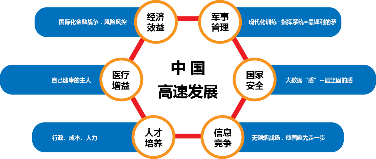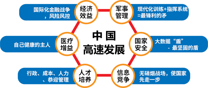 大数据中国高速发展的利器:在军事管理、国家安全、信息竞争、人才培养、医疗增益、经济效益方面,大数据力拔头筹。